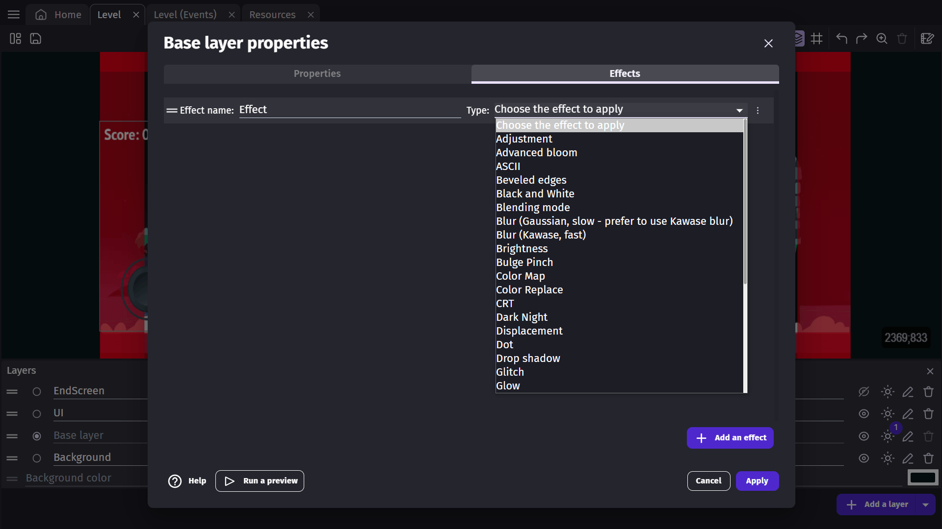 A new layer effect is named "Effect" when created. This name will be useful later for modifying the parameters of the effect during the game.
