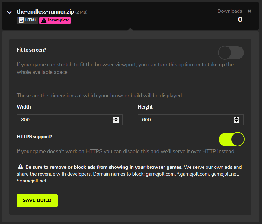 After the file has uploaded successfully, you will need to fill in the height and width specifications for your game. Click on Save Build once you are done here.